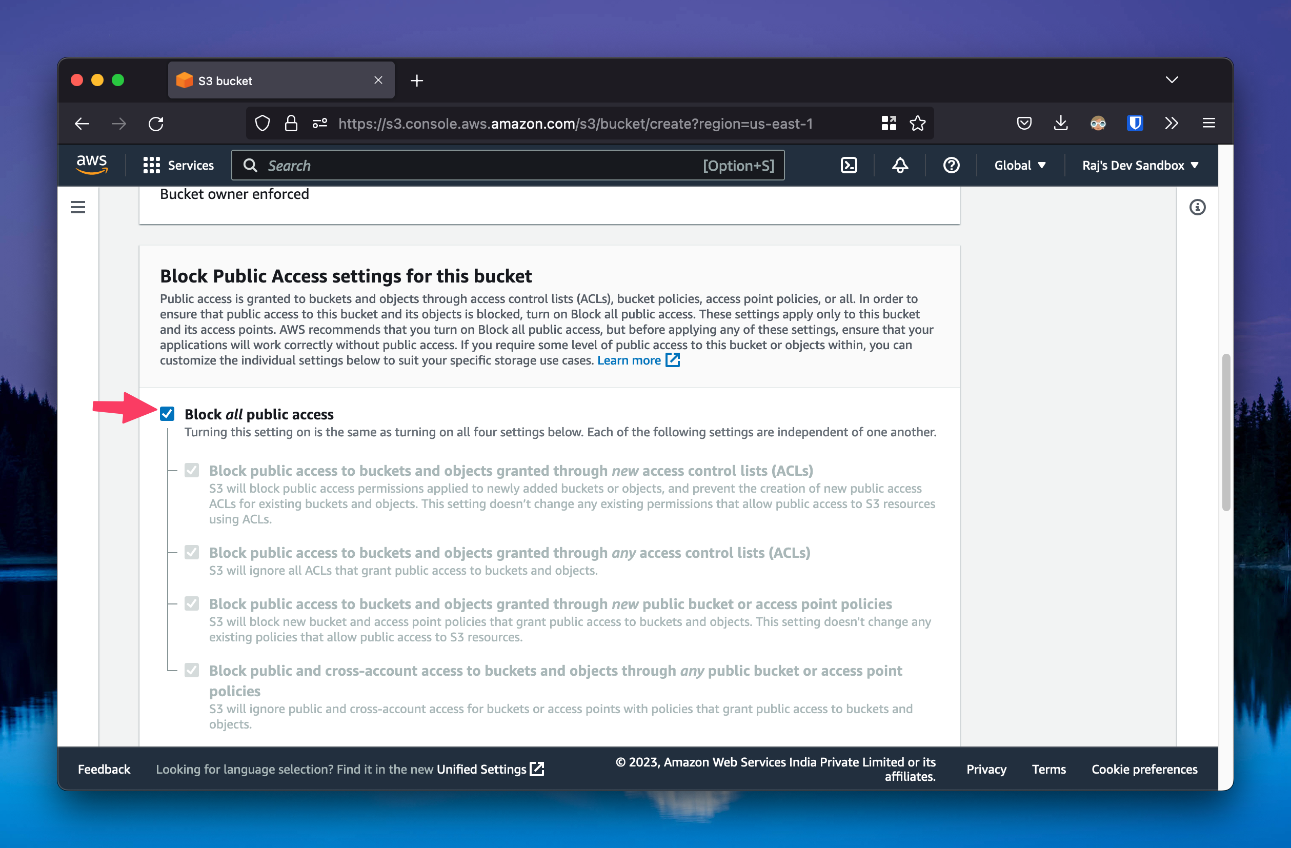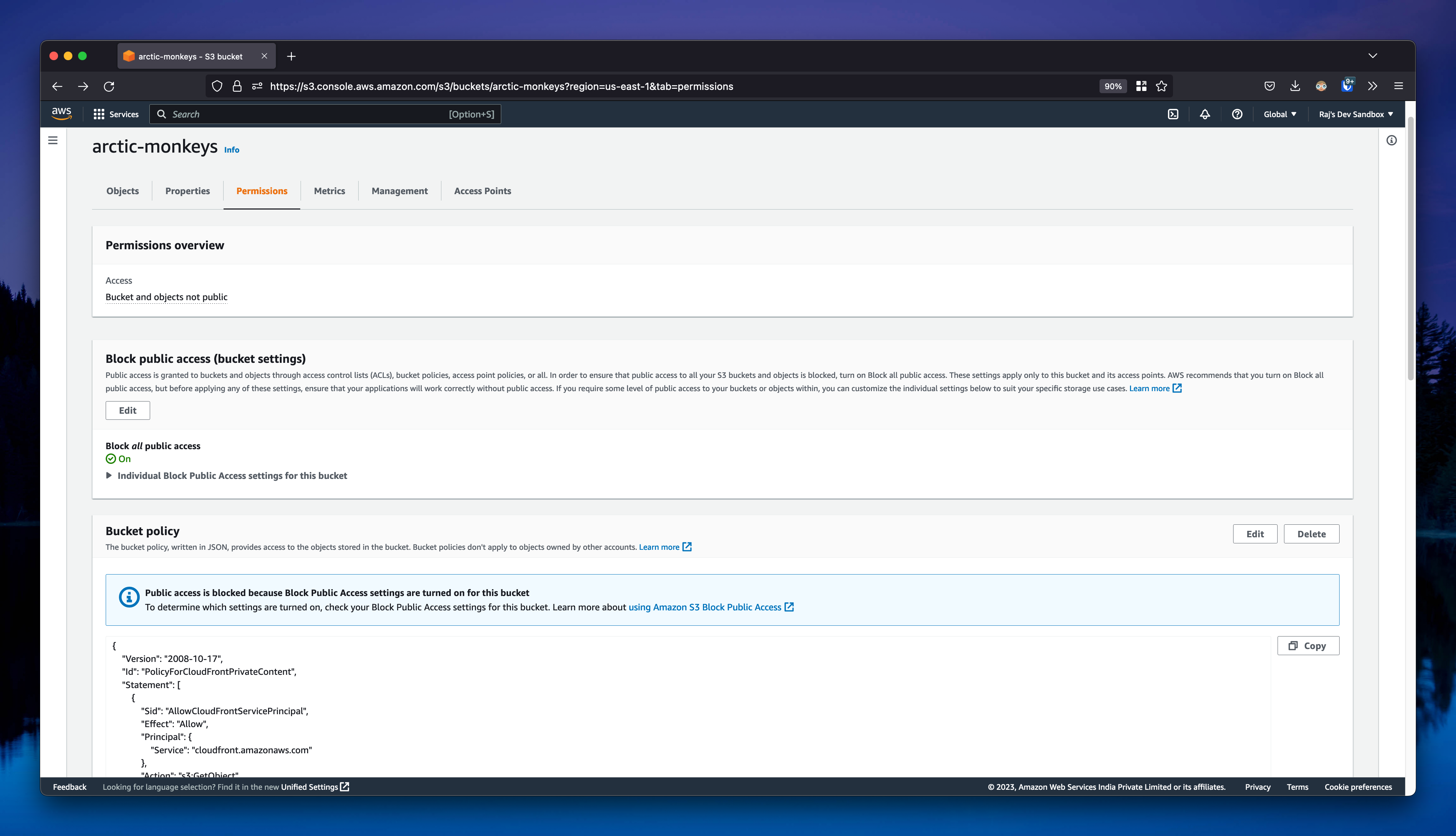 First, create a new S3 bucket. I’m calling mine arctic-monkeys. You can go with the default settings. Enable the setting to Block all public access to the bucket, so that the bucket itself is private by default.