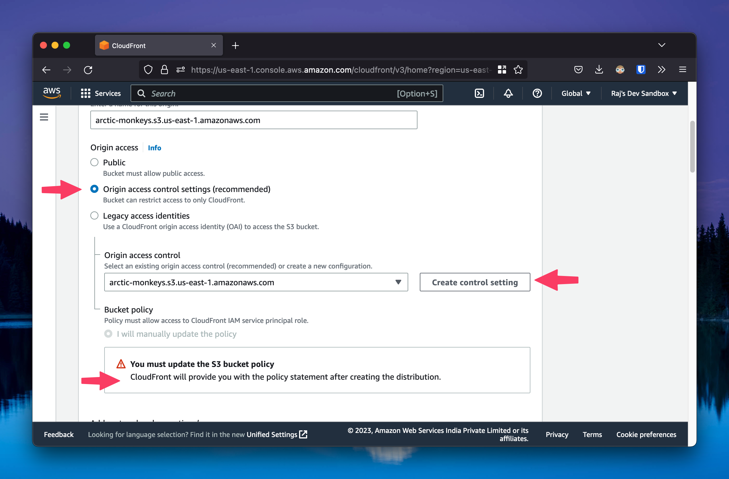Now, create a CloudFront distribution to serve the content from the S3 bucket. Select the S3 bucket you just created as the origin. You can go with the default settings. In “Origin Access” setting, select Origin access control settings (recommended), create a control setting.