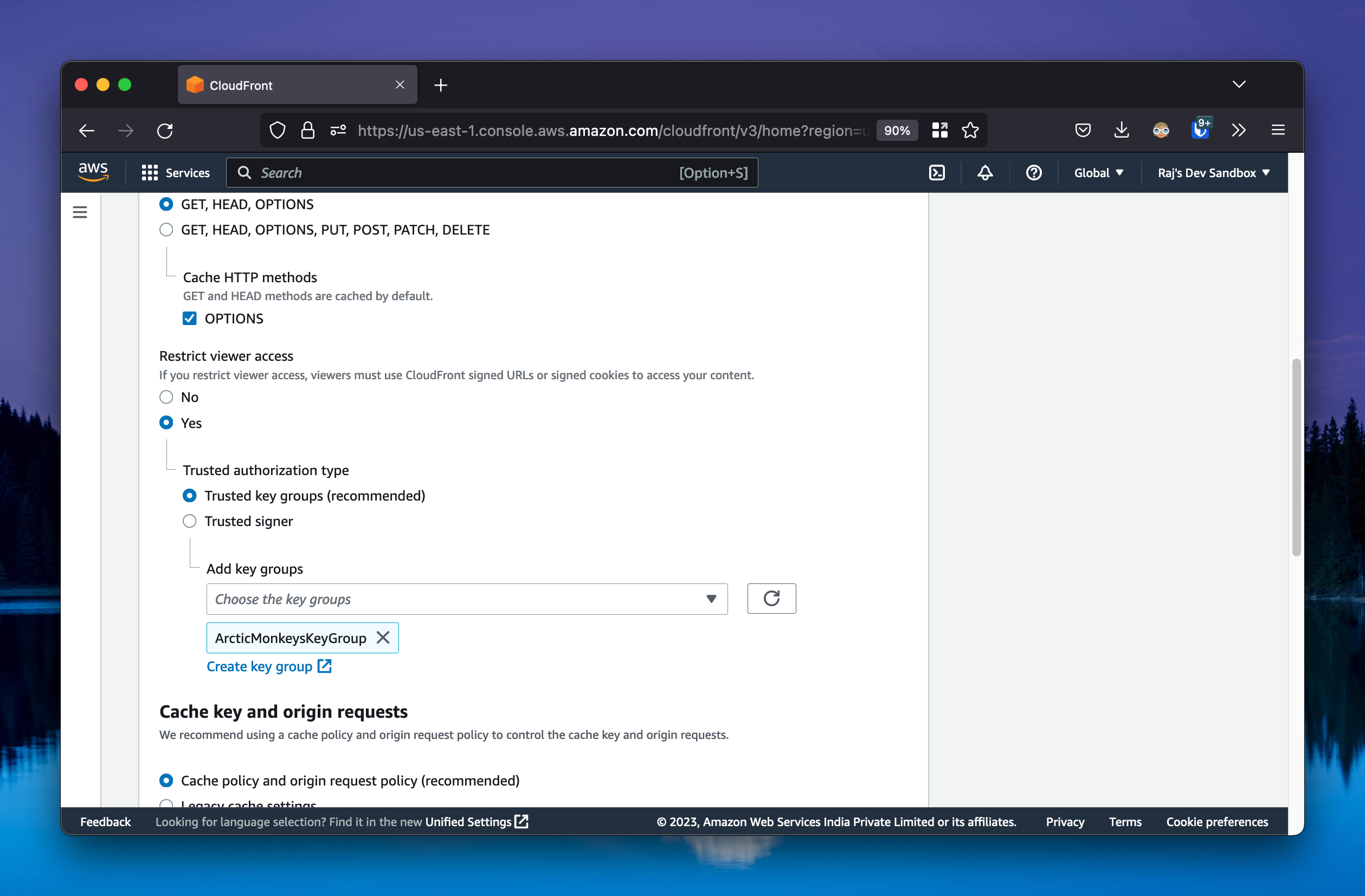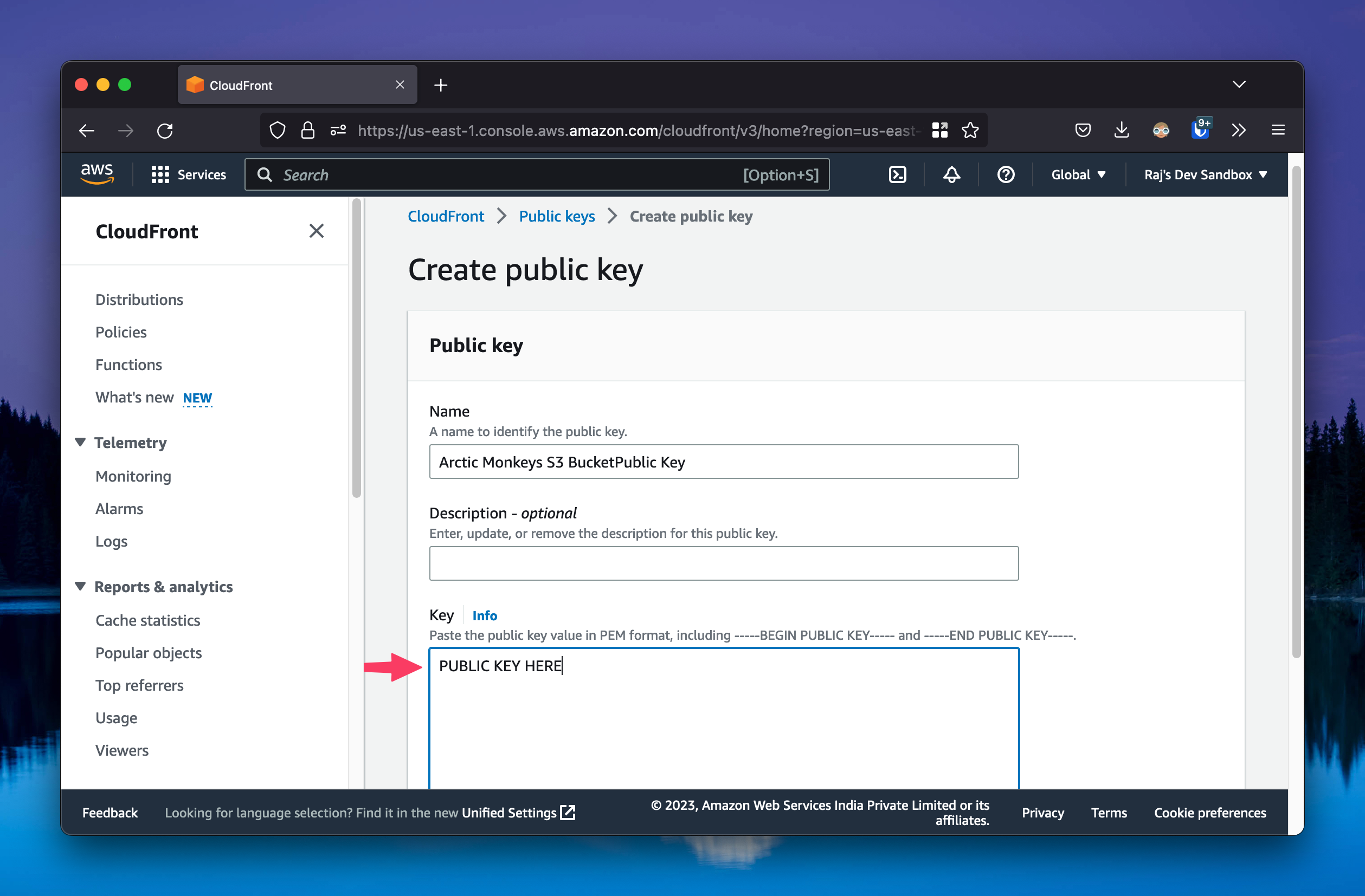 This will create a file called public_key.pem in the current directory. Now, we need to add the public key to the CloudFront distribution. Go to the CloudFront distribution you created in the previous step, and add the public key ->