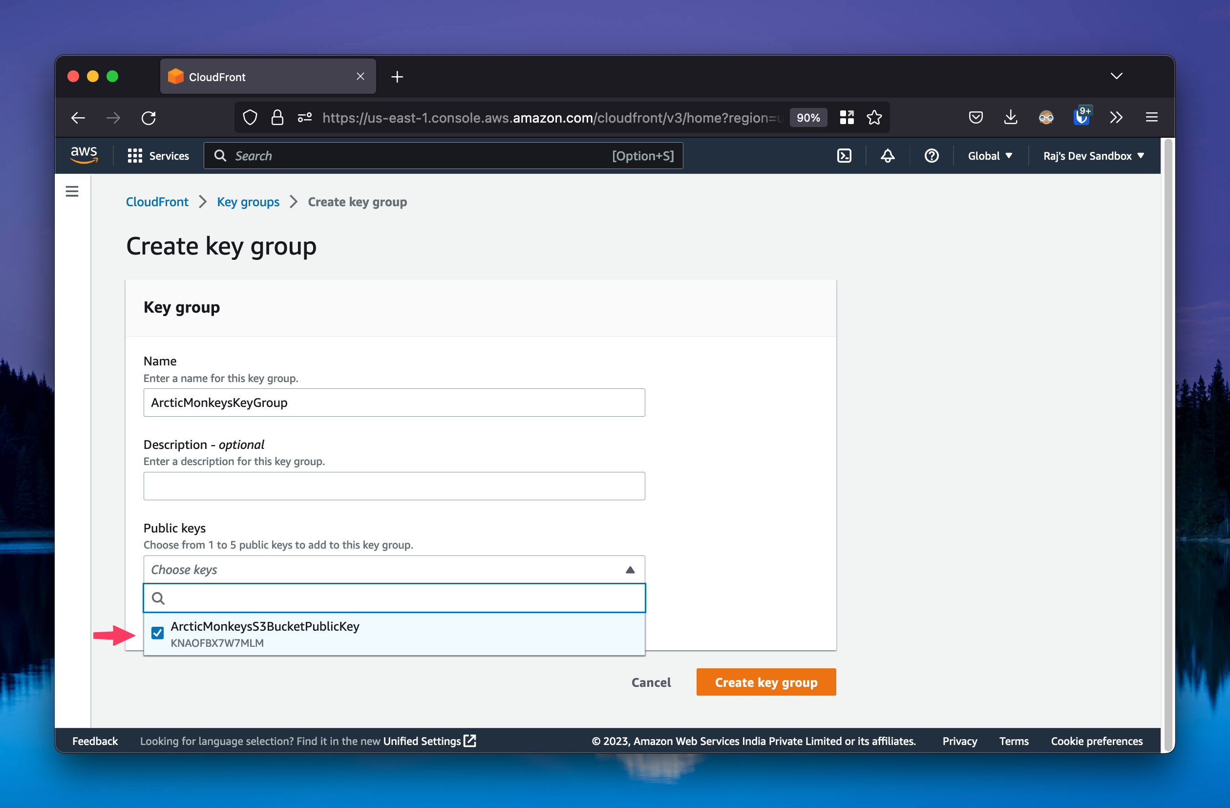 You can do this by going to the CloudFront console -> Key groups -> Create key group. Give it a name, and add the public key to the key group.